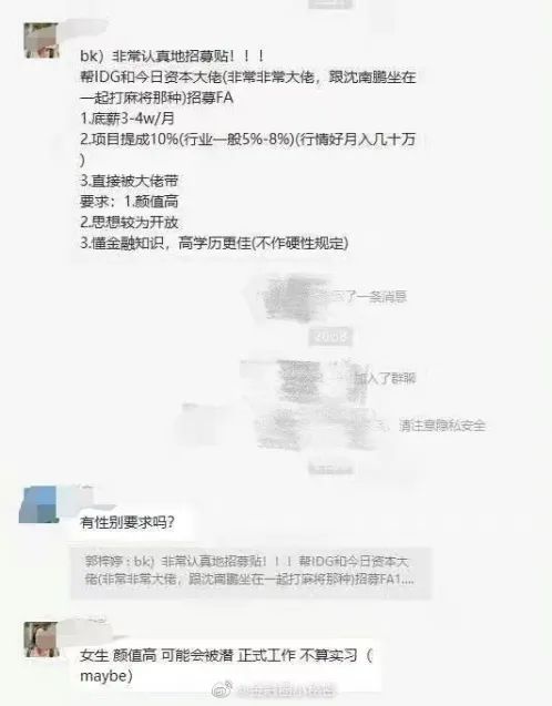 微博用户@金融圈小秘密也爆料过,IDG和今日资本,公开招聘月薪3万-4万的员工,要求颜值高、思想较为开放,最后还加了一句“女生,颜值高,可能会被潜”……