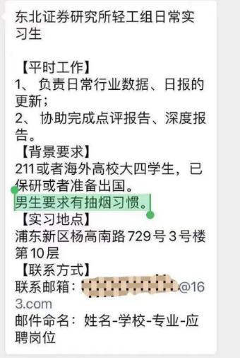 还是这一年,东北证券研究所轻工组招实习生,【背景要求】里有一条:男生要求有抽烟习惯。