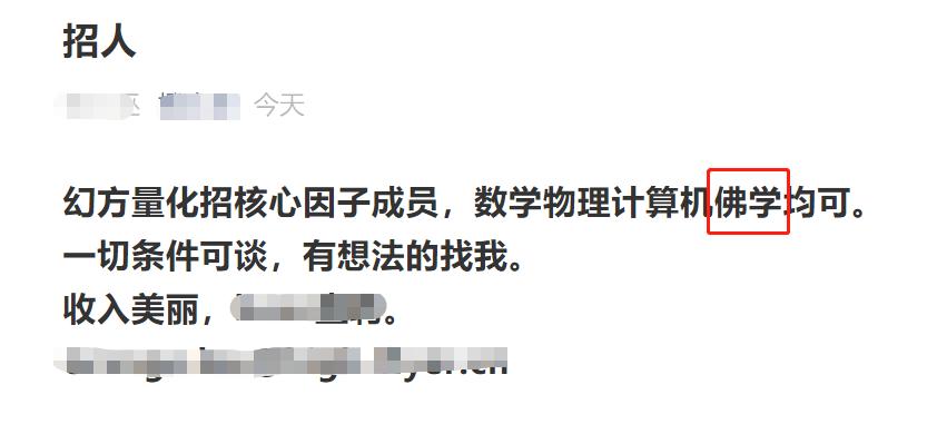 “佛学”毕业,也能勇闯金融圈年薪百万了?后来幻方量化出来解释称:“因为好多人谈论起量化圈,都觉得量化模型就是个黑匣子,很多情况都解释不了,量化投资也因此经常被大家称作玄学,所以招聘帖上就开玩笑写了佛学。”