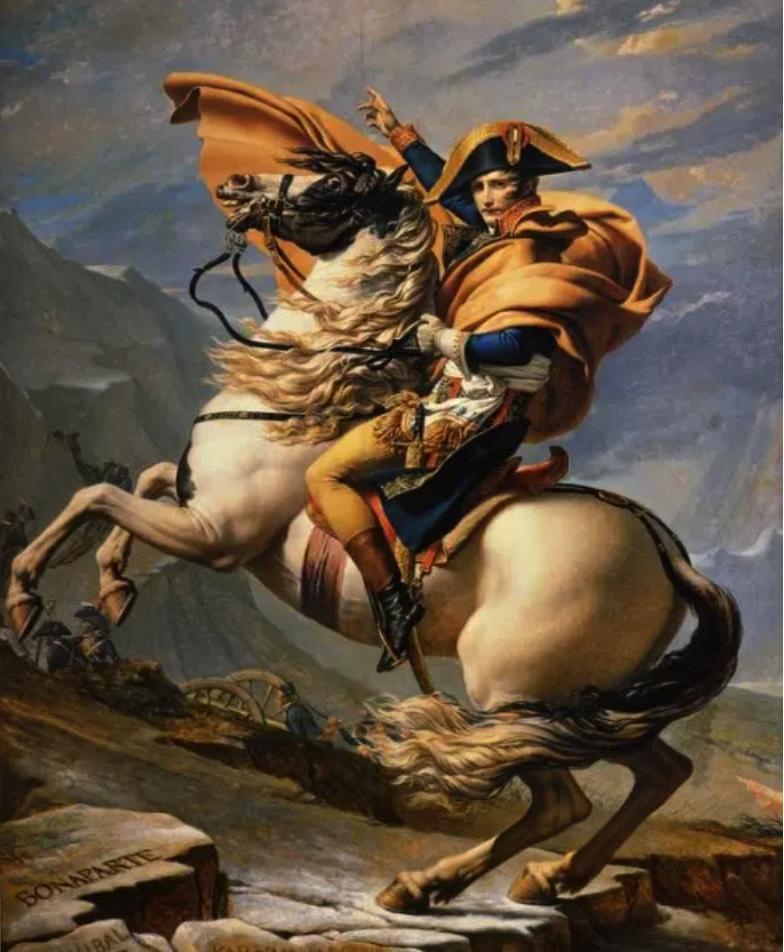 Prompt:Jacques-Louis David 的《拿破仑穿越阿尔卑斯山》——这幅作品展示了拿破仑和他的军队于 1800 年 5 月通过大圣伯纳德山口穿越阿尔卑斯山的真实穿越的强烈理想化景象。
