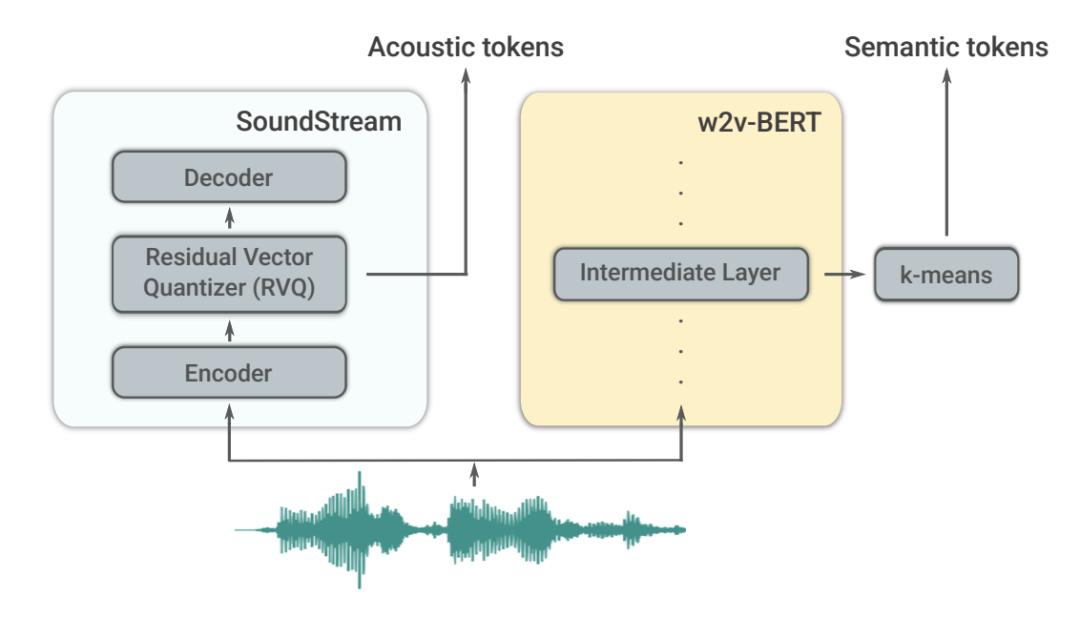 具体来说,该方法区分了两种标记类型:(1)语义标记,允许对长期结构进行建模,这些标记是从对音频数据进行训练的模型中提取的,目的是对语言进行建模;(2)声学标记,由一个神经音频编解码器提供,用于捕捉精细的声学细节。这使得 AudioLM 能够生成连贯的、高质量的语音以及延续的钢琴音乐,而不需要依赖转录本或符号化的音乐表示。
