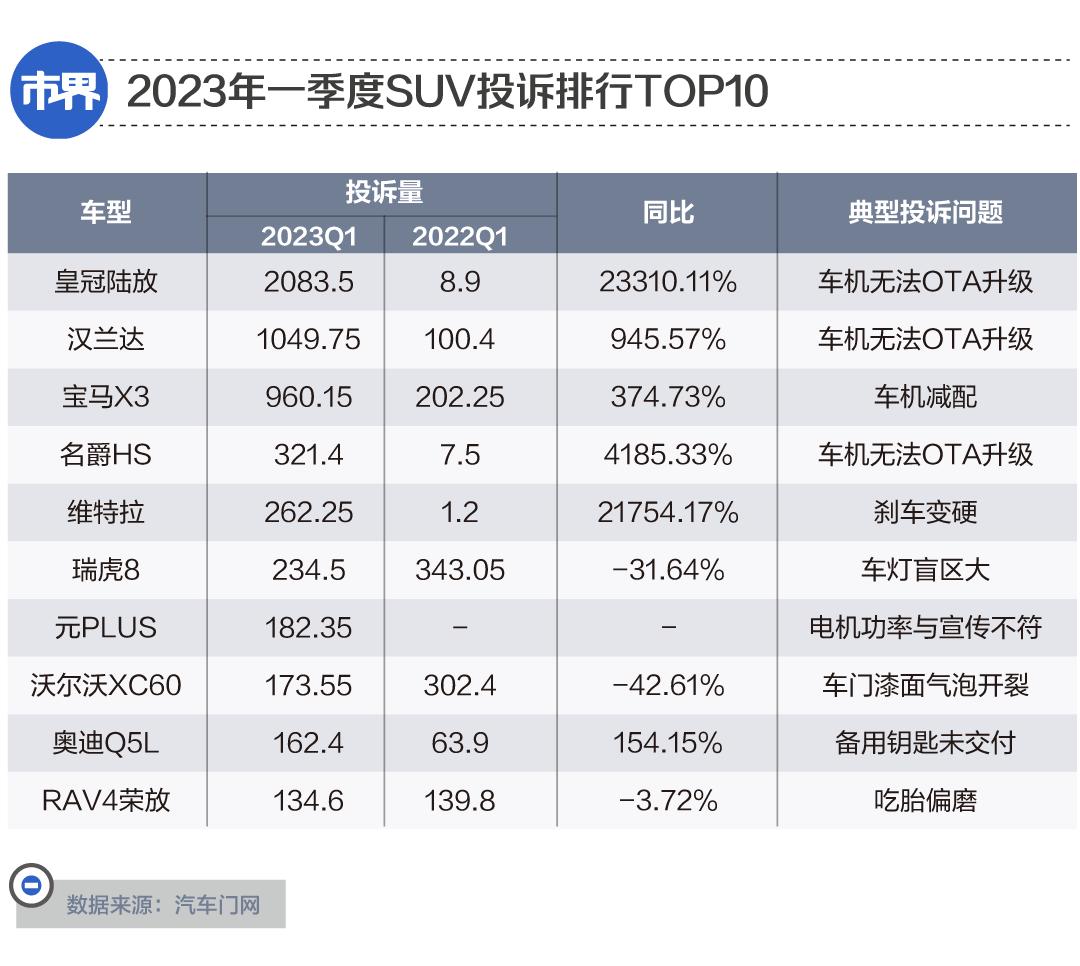 不久前,汽车门网公布的2023一季度SUV投诉指数显示,投诉量最高的四款车型,均是因为车机问题被投诉,其中前两名均为丰田旗下车型。在2023年2月车企投诉榜上,一汽丰田和广汽丰田蝉联冠亚军,典型投诉问题均有车机无法升级,上榜的10个厂商有6个和车机相关投诉有关。