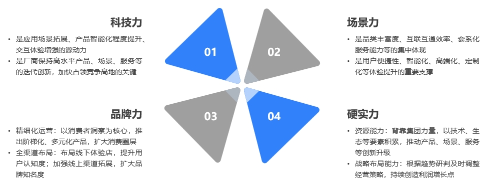 品牌力是全屋智能厂商扩大影响力的保障。智能家居企业往往借助精细化运营、全渠道布局等方面能力,扩大品牌知名度、扩充消费圈层的同时,带动行业整体认知度提升。例如,以用户洞察为核心,推出阶梯化、多元化产品,用以满足消费者不同层次的需求;实施线上线下融合发展模式,创新布局线下体验店,通过高质量交互体验,提升用户认知度;同时加强线上渠道拓展,利用新兴社交媒体扩大品牌知名度。