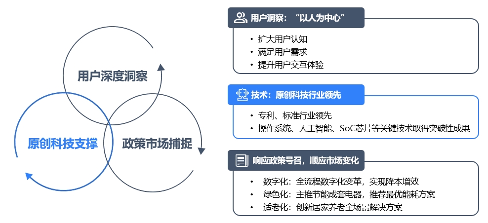 硬实力决定着全屋智能厂商发展速度和发展高度,考验的是厂商资源、战略布局等综合能力和前瞻性眼光。资源能力往往背靠集团力量,以技术、生态等要素积累,推动产品、场景、服务等创新升级。战略布局能力以深度洞察政府政策、行业趋势等为基础,以用户需求为核心及时调整经营策略,持续创造利润新增长点。