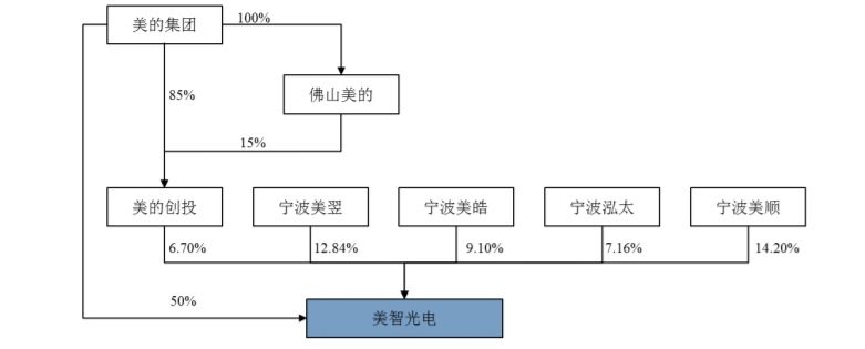 目前,美的直接持有美智光电50%股份,并通过全资子公司美的创投间接持有美智光电6.7%的股份,合计持有美智光电56.7%股份,为其控股股东。美的创始人何享健通过美的集团间接控制美智光电,为其实际控股人。