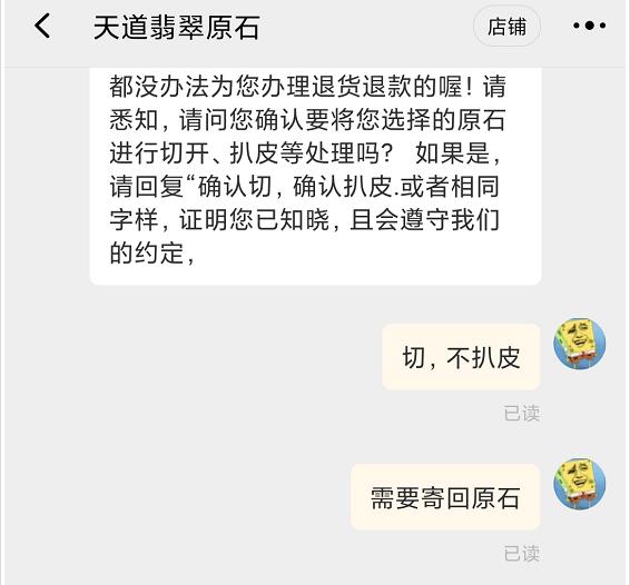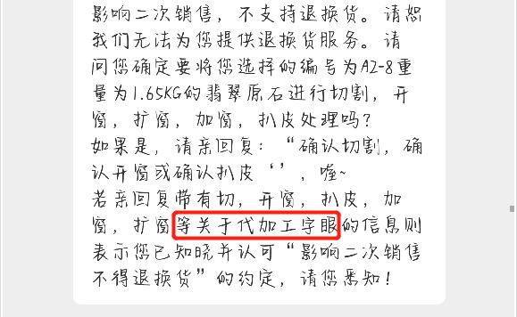 只要确认了代加工,那么当购买的原石切开发现不是翡翠后,便会被加工成一个看不出原样的石头,从而完成定作的标准。也就是说,很难再退货退款。