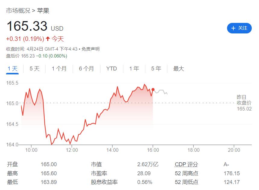 周一早盘苹果股价一路走低,午后反弹,最终收涨0.2%,报165.33美元。