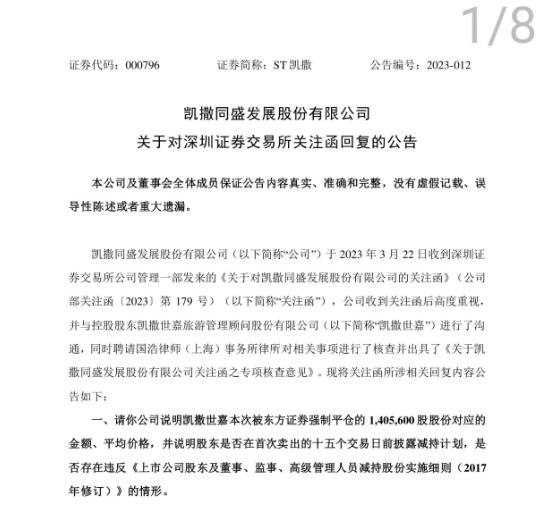 3月22日,ST凯撒收到深交所关注函,要求说明控股股东持股若进一步被强制平仓,是否可能致公司控股股东、实控人变更。