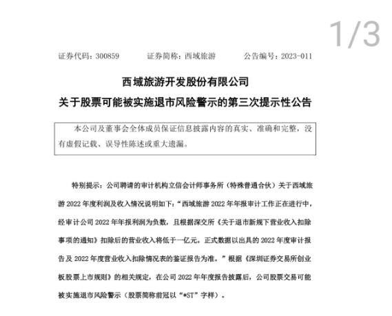 根据《深圳证券交易所创业板股票上市规则》的相关规定,在西域旅游2022年年度报告披露后,该公司股票交易可能被实施退市风险警示(股票简称前冠以“*ST”字样)。