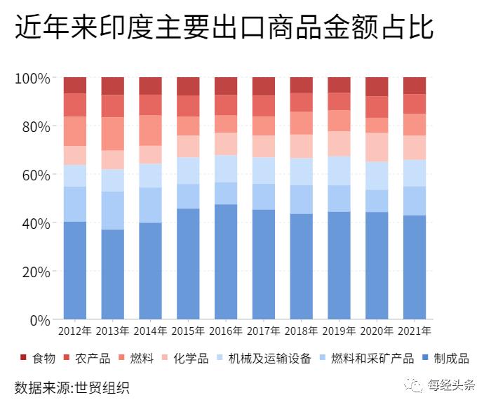 据商务部发布的《对外投资合作国别(地区)指南——印度(2021年版)》,印度主要出口商品为矿物燃料产品、贵金属及制品、机械设备等。