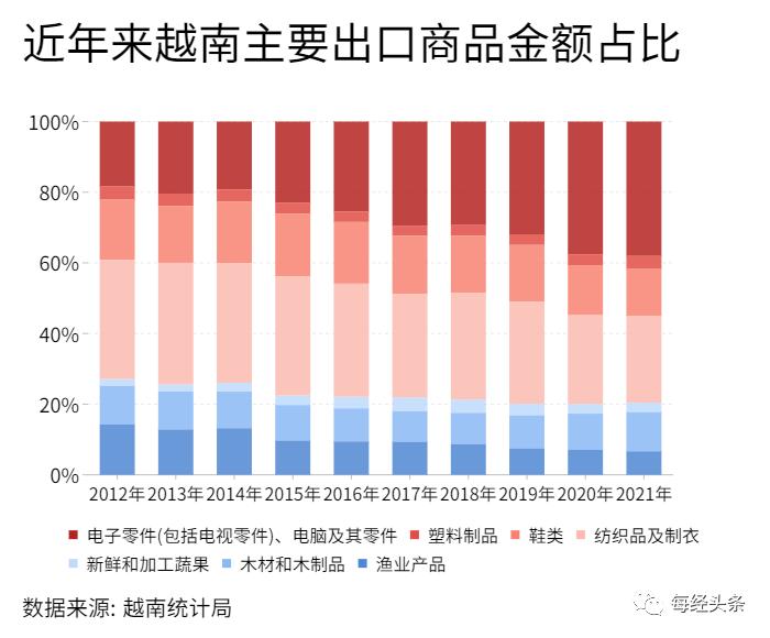 《每日经济新闻》记者梳理发现,在越南出口商品中,手机及零配件,电脑、电子和零配件,机械设备和零配件,纺织品四类商品的地位举足轻重,其出口额在越南2023年一季度出口总额中占比52.8%。