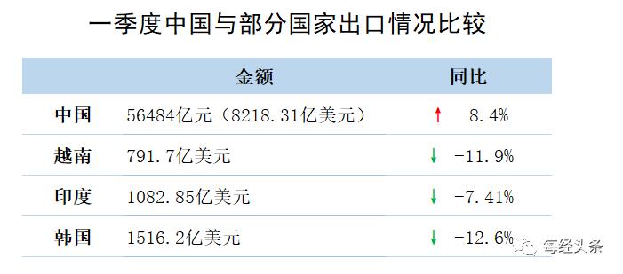 一季度,我国货物出口56484亿元(8218.31亿美元),增长8.4%。这份成绩单来之不易。对比其他出口导向型国家,我们看到,越南一季度出口同比下降11.9%,韩国下降12.6%,印度下降7.41%。