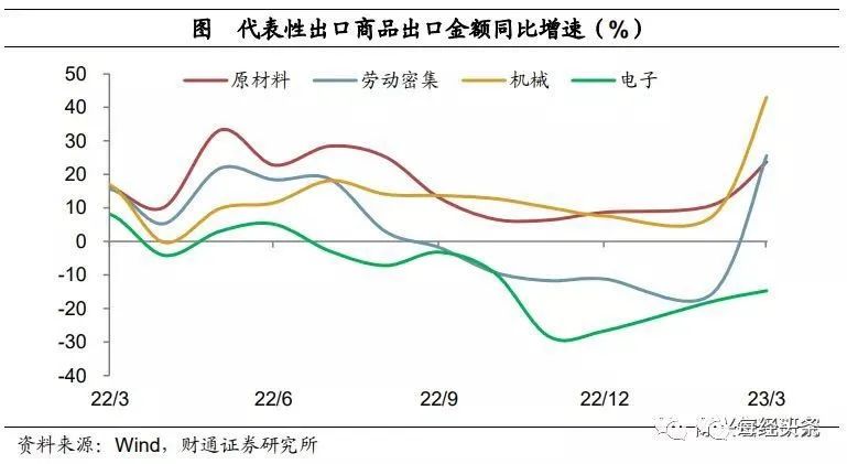 财通宏观陈兴团队认为,从商品类别上来看,机电设备对于3月出口增速的拉动在7个百分点以上,劳动密集型产品则接近3.5个百分点,而原材料类的拉动不到3个百分点,机电设备之中机械和电子呈现明显的分化态势,机械表现相对偏强,而电子产品对出口仍有拖累,从海关总署所披露的商品信息来看,机械偏强的原因主要在于中游装备制造类行业的支撑,值得一提的是汽车链的表现依然较好。