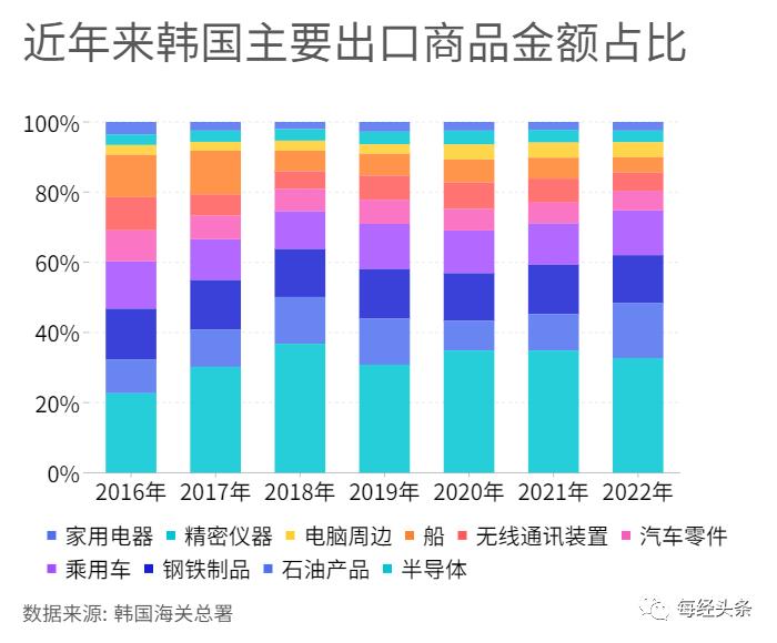 记者梳理相关数据发现,近年来,韩国出口商品中,半导体、石油产品、钢铁制品、乘用车等占据较大份额,且结构多年来没有太大变化,应对风险或变化的能力有限。