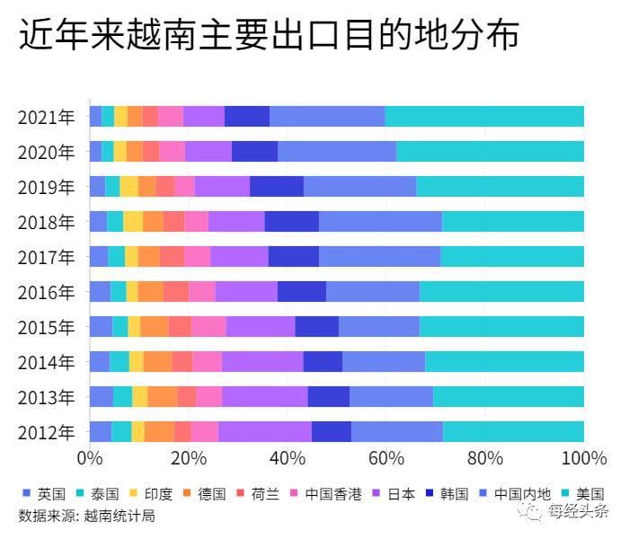 据我驻胡志明市总领事馆援引越通社消息,2023年第一季度,美国是越南最大的出口市场,预计出口金额达206亿美元。而越南一季度出口总额为791.7亿美元,即对美份额约为26%。