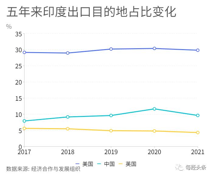 近年来,印度对美国出口份额一直保持在30%左右,对中国出口排在第二位,份额10%左右,且这种格局长期没有太大变化,美国对其商品的需求直接可影响印度的出口走势。