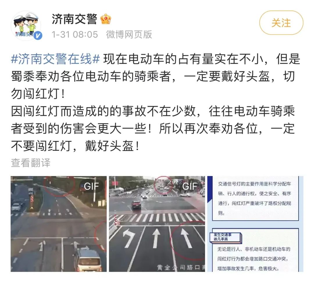 济南的交警也时常感到头疼,不得不发出安全提示。没办法,密密麻麻的电动车贴着公交车边,自行车混在电动车里,电动车上风驰电掣的“济南老师儿”还老是不戴安全帽。