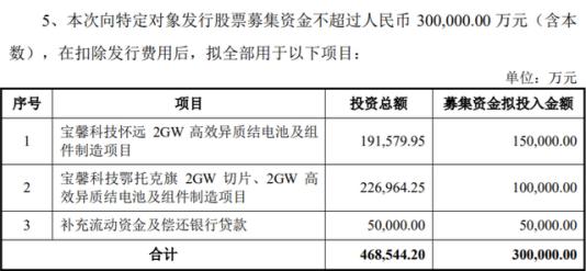 但在资本市场春风得意的宝鑫科技自然有应对措施。抛出了30亿元的定增募资,分别用于怀远2GW高效异质结电池及组件制造项目(总投资19.16亿元,定增募资投入15亿元);宝馨科技鄂托克旗2GW切片、2GW高效异质结电池及组件制造项目(总投资22.7亿元,定增募资投入10亿元);5亿元用于补充流动资金及偿还银行贷款。