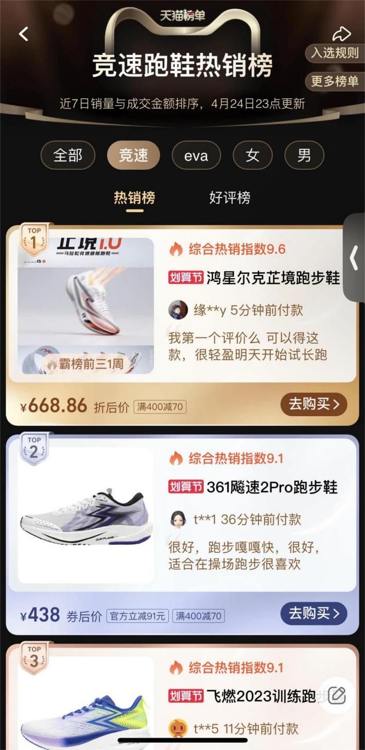 得物App显示,“芷境1.0”于3月3日首发,已有2000多人付款。这款产品在4月24日的天猫竞速跑鞋热销榜排中在第一位,而且已在前三名中停留了一周。