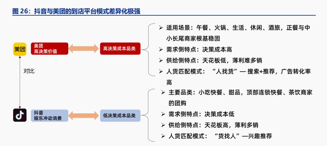 第一,供给侧方面,美团商家和长尾商家多,抖音对大客户更友好。