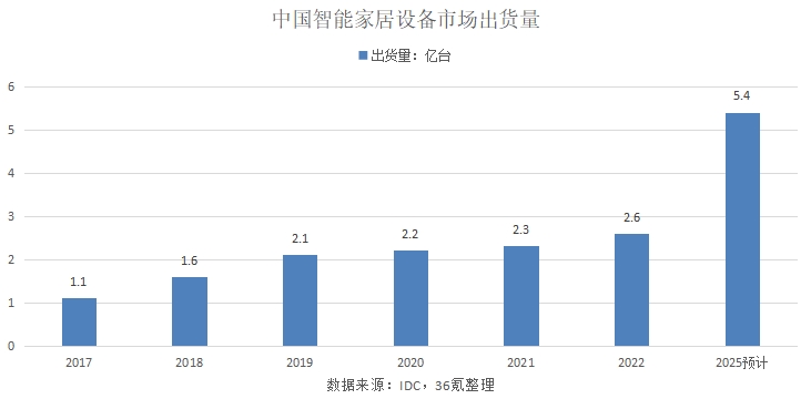据全球市场调研机构IDC的跟踪报告数据显示,2022年中国智能家居设备市场出货量突破2.6亿台,同比增长17.1%,预计未来智能家居市场将快速发展,2025年市场出货量有望接近5.4亿台,市场规模将突破8000亿元。