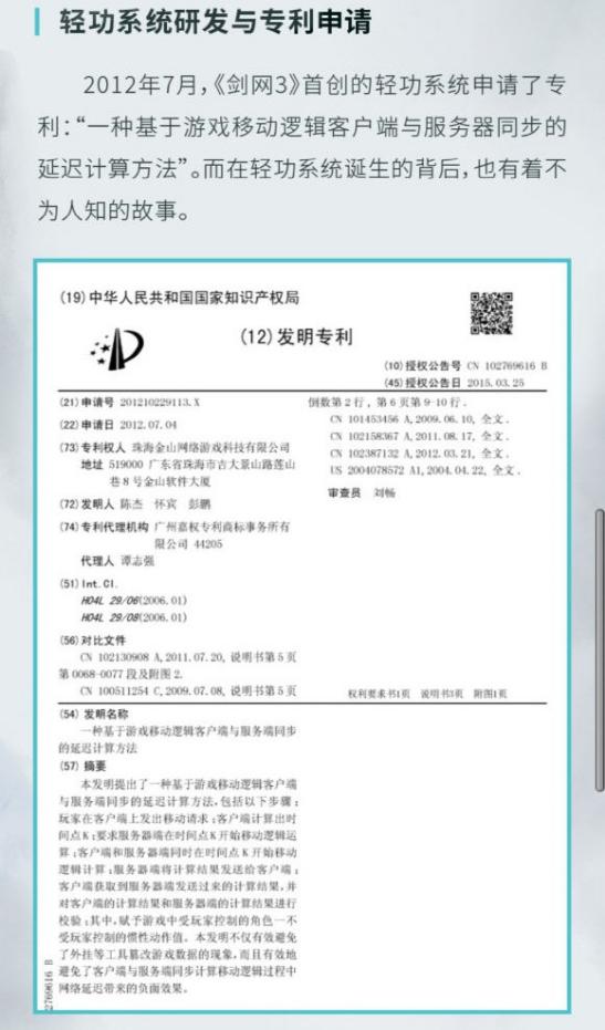 从贴地跳跃到大轻功的发展过程中,《剑侠情缘三》在这一系统上取得了突破性进展。在翅膀和飞行坐骑盛行时,金山网络申请了一项名为“一种基于游戏移动逻辑客户端与客户端同步的延迟计算方法”—— 即轻功的发明专利。有趣的是,据说这一发明的灵感最初来源于游戏中无限连跳的bug。