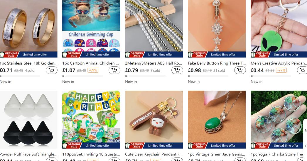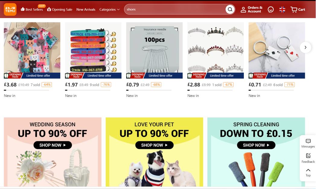 在英国站的首页上,0.79英镑100个的扣针、3.68英镑的T恤、1.97英镑的宠物项圈,应有尽有。