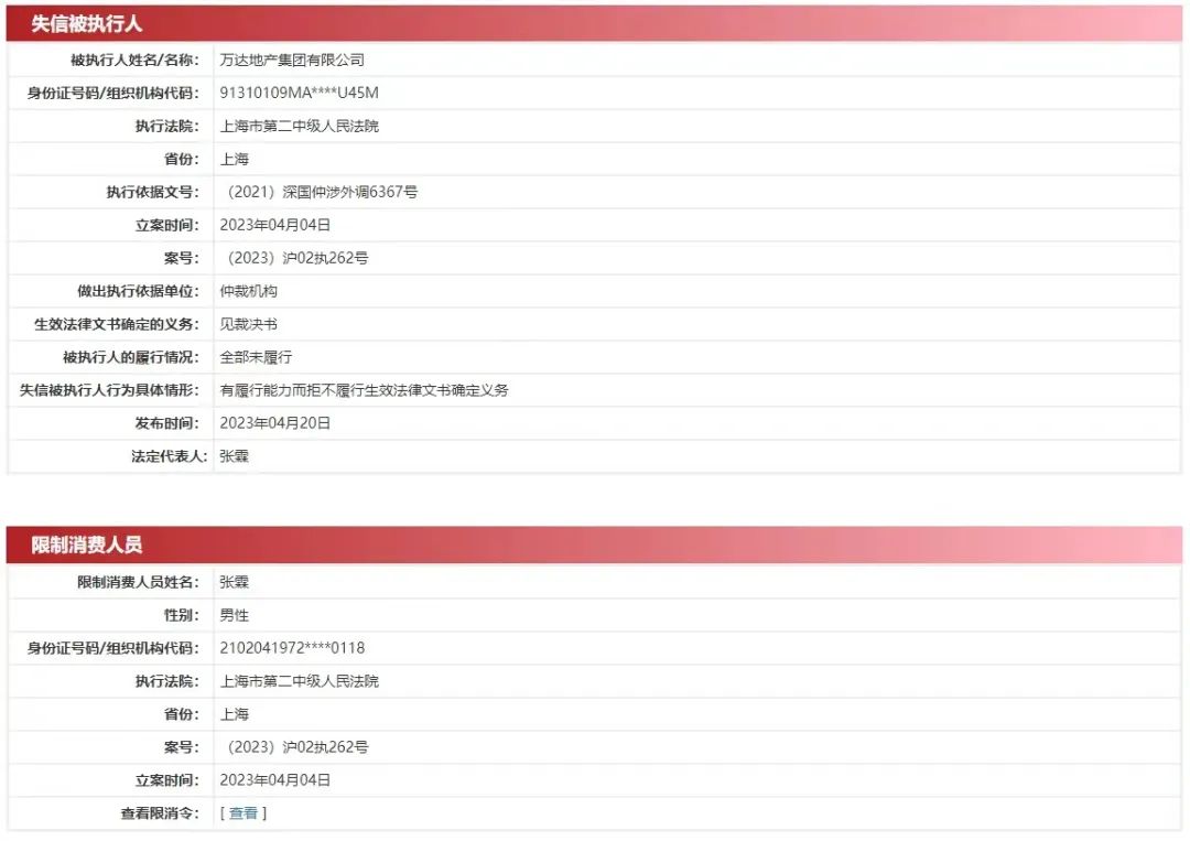 同时,万达地产原法人代表张霖,被限制高消费,近期其卸任万达地产法人,可能与此次被执行有关。