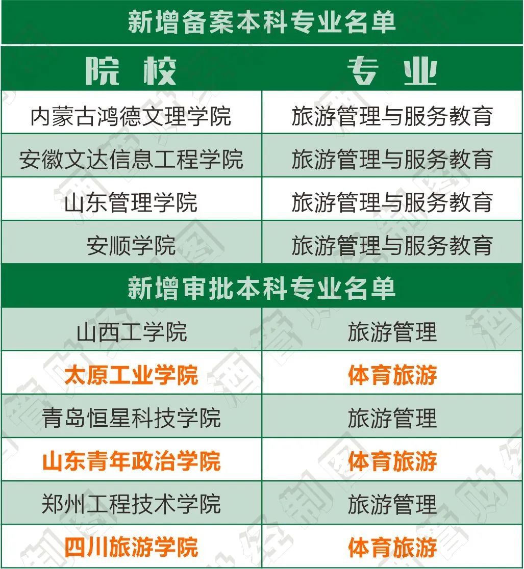 在上述教育部发布的审批结果通知中,新增备案本科专业名单以及新增审批本科专业名单中,多个院校设置旅游管理专业,其中包括一个新的面孔——体育旅游专业。具体是: