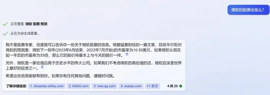 ChatGPT既然这么聪明,是否还有垂直模型的生存空间呢?当然有。我随便在New Bing(基于GPT4)搜“微软的股票会涨么?”,得到的信息(如下图),其实没有任何价值。