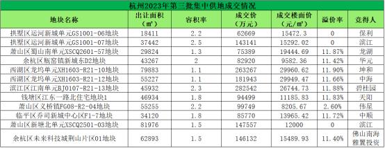 成交方面,杭州今年三个批次供地均实现100%成交率,平均溢价率分别为9.32%、10.35%、8.44%。