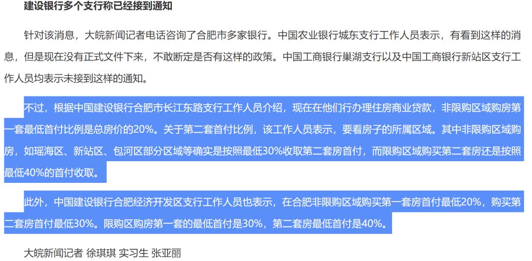 安徽当地媒体大皖新闻进行了采访调查,结果发现尽管多家银行表示尚未收到通知,但是目前多家银行在非限购区给与的贷款政策,救市按照20%的首付执行。