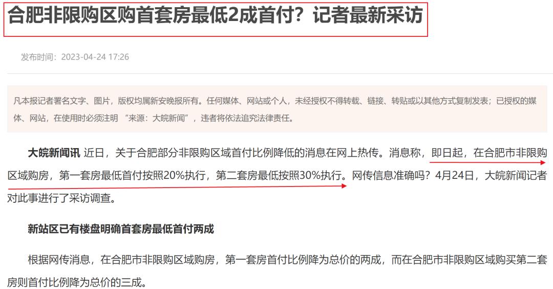 4月24日,一则合肥市非限购区购房,首套房首付降至20%,二套房降至30%的消息在网上热传。
