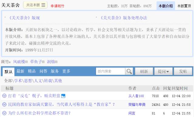 天涯社区最早开设的版块——关天茶舍,曾经是人文思想界的重镇。
