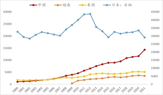 2000年,中国制造业人均工资为每年1057美元,仅相当于日本人力成本的3%,2021年我国制造业人均工资提升至每年14295美元,已接近日本的50%。而以泰国为例的东南亚国家,2000年制造业人均工资每年1789美元甚至略高于当时的中国,至2021年时也仅翻了2.8倍(每年5089美元),比中国低了近2/3。