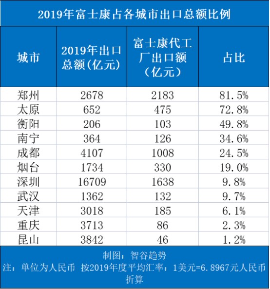 从2019年的富士康占各城市出口总额比例来看,郑州2019年出口总额2678亿元人民币,富士康贡献了2182亿元,占比 81.5%;太原2019年出口总额651亿元,富士康贡献474亿元,占比72.83%;衡阳2019年出口总额206亿元,富士康贡献103亿元,占比49.8%…