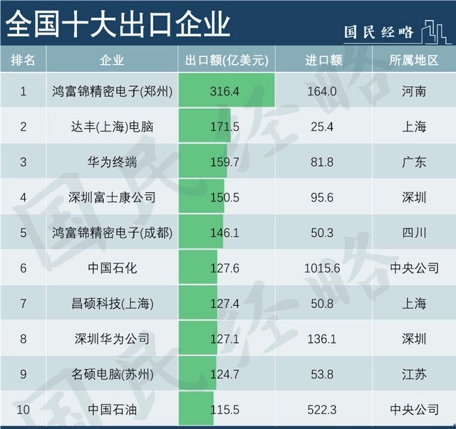 根据2019年的进出口数据,中国对外经济贸易统计学会曾发布了一份中国外贸500强企业排名(2020年),在十强出口企业中,富士康系占了3席,郑州富士康、深圳富士康、成都富士康分别位居第1、第4和第5。若是看500强的外贸企业,至少有16家为富士康或其关联企业。
