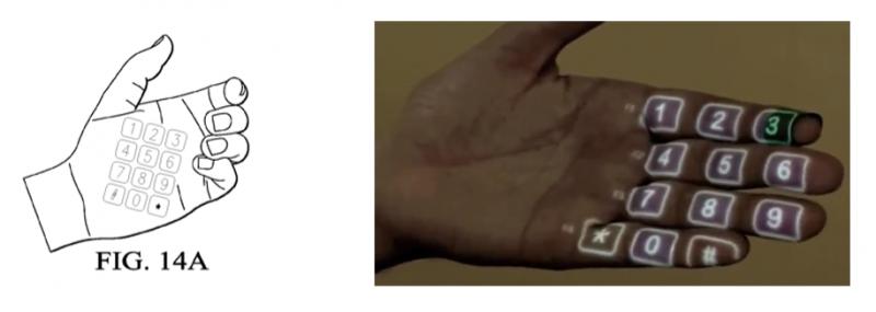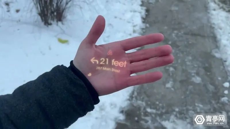 该方案可以将AR界面投影到你的手掌上,显示时间/日期、数字键盘、导航、温度/恒温器UI等信息,在你不需要时则停止投影。除此之外,也可以将AR投影到你工作的台面上,协助烹饪、汽车修理等任务,比如标记对象、并提供与对象相关的文本或指令。