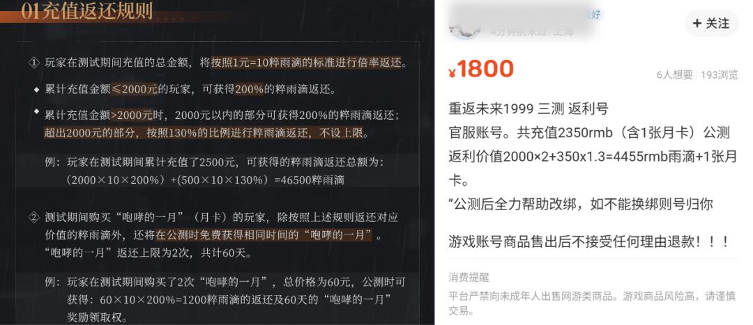 例如《重返未来:1999》计费删档测的充值返利规则是:按照1元=10粹雨滴的标准进行倍率返还;累充金额≤2000元,返还倍率200%,累充金额>2000元部分,返还倍率为130%,不设上限(一般都会设上限)。此外测试阶段的月卡会在公测时免费续上,返还上限为2次(共计60天)。