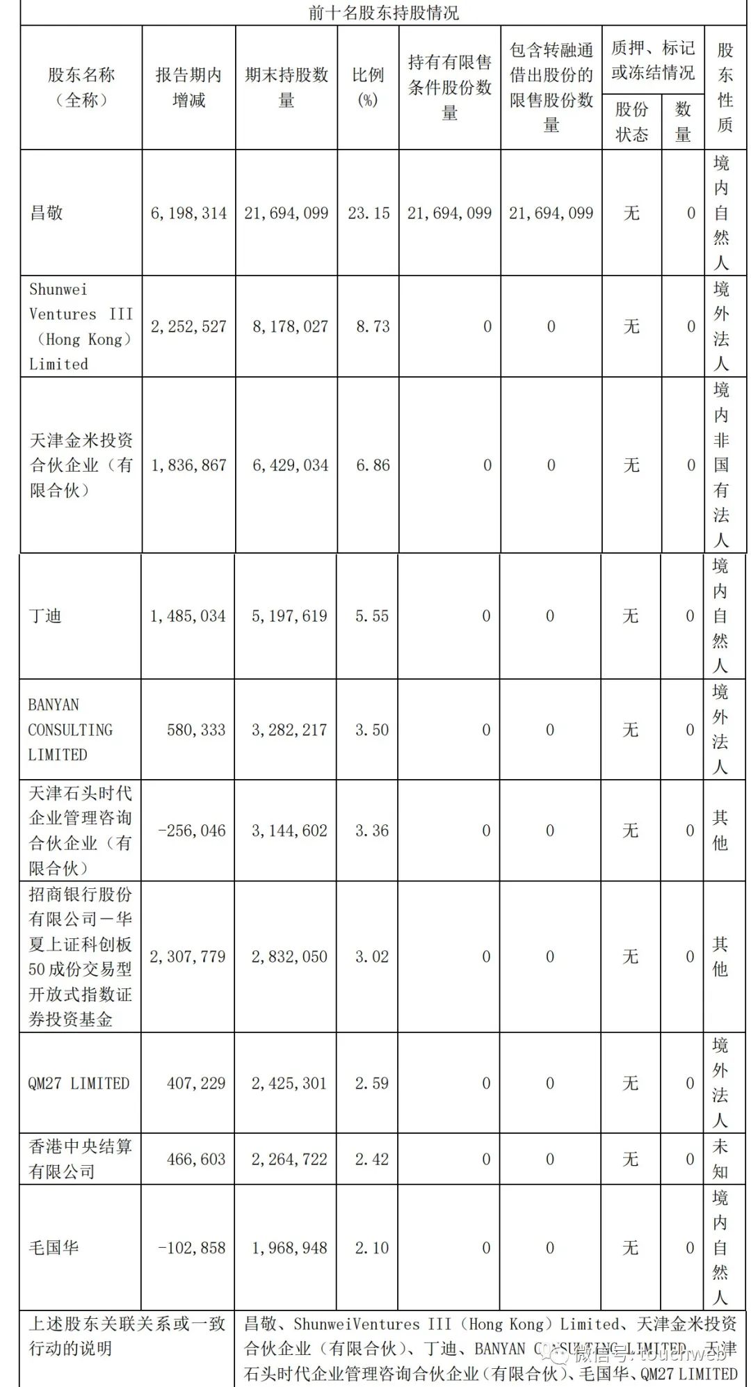 招商银行股份有限公司-华夏上证科创板 50 成份交易型开放式指数证券投资基金持股为3.02%,启明旗下QM27 LIMITED持股为2.59%,香港中央结算有限公司持股为2.42%,毛国华持股为2.1%。
