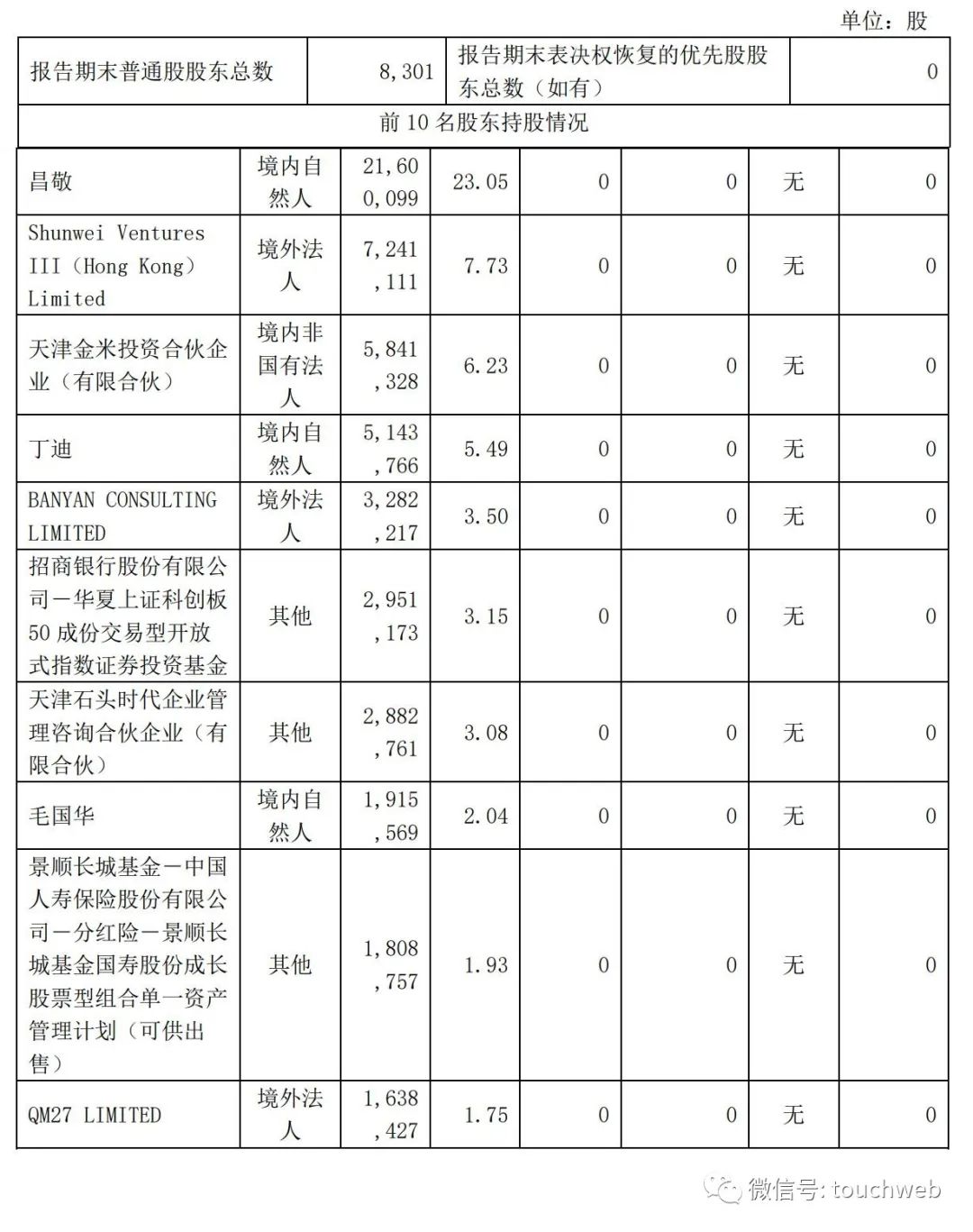 截至2022年6月30日,昌敬持股为23.2%,顺为旗下ShunweiVenturesIII持股为8.74%,小米旗下天津金米投资合伙企业(有限合伙)持股为6.87%,丁迪持股为5.56%;