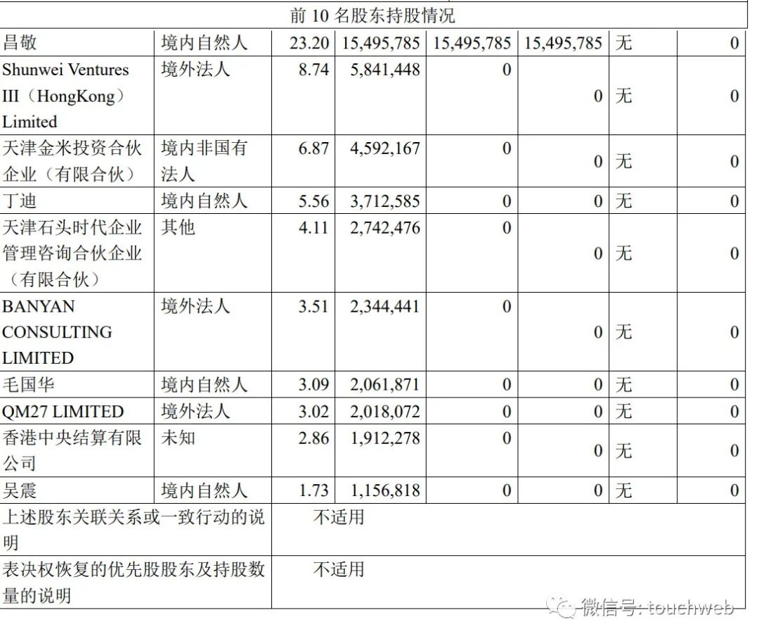 天津石头时代企业管理咨询合伙企业(有限合伙)持股为4.11%,高榕资本旗下BANYANCONSULTING LIMITED持股为3.51%,毛国华持股为3.09%,启明旗下QM27 LIMITED持股为3.02%,香港中央结算有限公司持股为2.86%,吴震持股为1.73%。