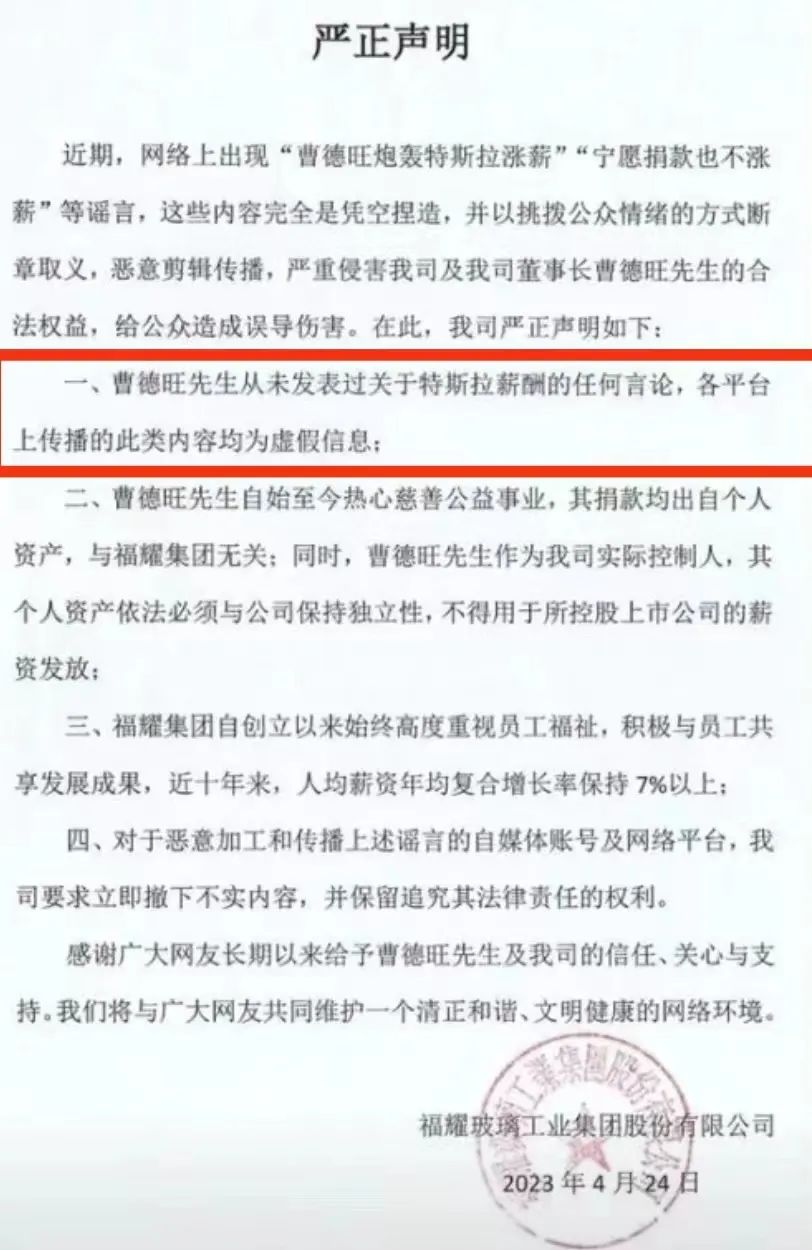 4月24日,福耀玻璃创始人曹德旺上了热搜。晚间,官方对外发了一则声明,称近期网络上出现的“曹德旺炮轰特斯拉涨薪”“宁愿捐款也不涨薪”等谣言,属凭空捏造、断章取义,恶意剪辑传播。