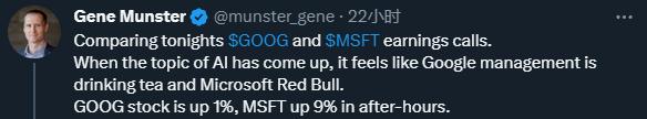 许多分析师也对谷歌表达了失望之情。深水资产管理公司执行合伙人Gene Munster昨日在评论两家公司财报的时候形容道,“感觉谷歌管理层在喝茶,而微软高管在喝红牛。”截至收盘,微软股价涨超7%,谷歌C则跌0.15%。