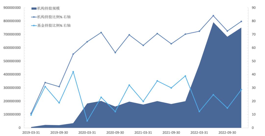 自从康龙A股在2019年上市,机构投资者总的持股规模与比例双双逐年上升。根据wind的不完全统计,22年末机构持有康龙A股流通股本的比例高达80%,其中基金的持股比例最高一度超过42%,长期的中位数也在25%左右,然而到今年Q1结束却减少到了11%。
