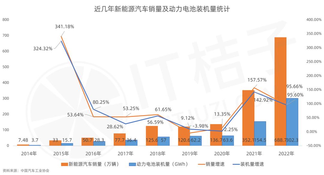 相对应,动力电池装机量也从 2014 年的 3.7GWh 升至 2015 年的 15.7GWh,增速 324.32%。之后不管是新能源汽车销量还是动力电池装机量都实现逐年上涨,到 2022 年新能源汽车销量达到 688.7 万量,较 2021 年增长超 90%,较 2015 年更是翻了超 20 倍。
