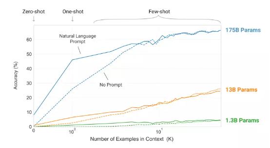 GPT-3 论文提到,参数在 10 亿至 1000 亿级别的模型只需几十个提示词,即可展示出令人印象深刻的学习能力。