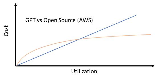 对于日均请求在 1000 次左右的低频使用场景,ChatGPT 的实现成本低于部署在 AWS 上的开源大模型。但面对每天数以百万计的请求,在 AWS 上部署开源模型则成本更低。