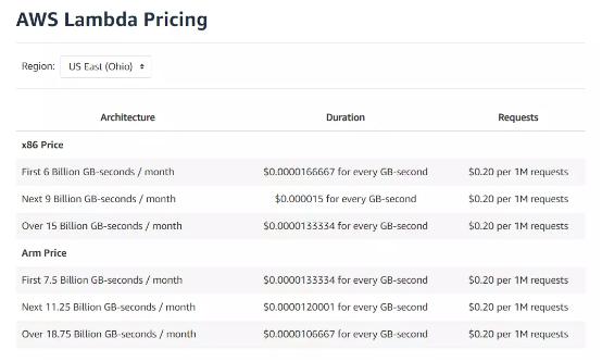 下面来看 AWS Lambda 部分的成本,它的价格由内存用量和请求频率决定。