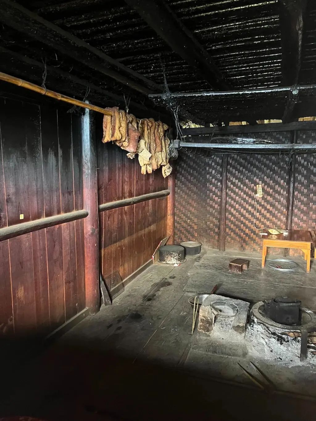 传统千脚楼的墙壁是用竹篾编织而成的,方便透气、透光,村民们还喜欢沿着墙壁悬挂腊肉。房屋的中则是水泥做底、木柴为燃料的火塘灶台。村民围绕着它烧菜做饭、烧水洗澡、聊天唱歌,夜幕降临时再把床沿火塘铺开,枕着余烬的温暖入眠。